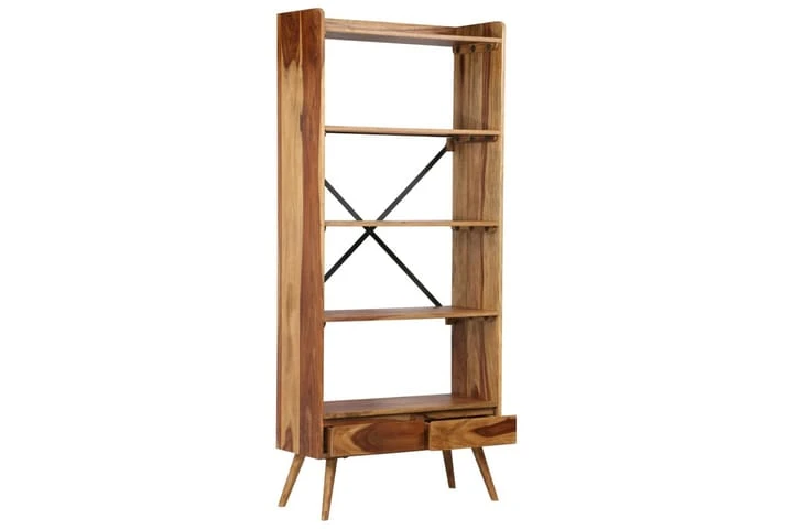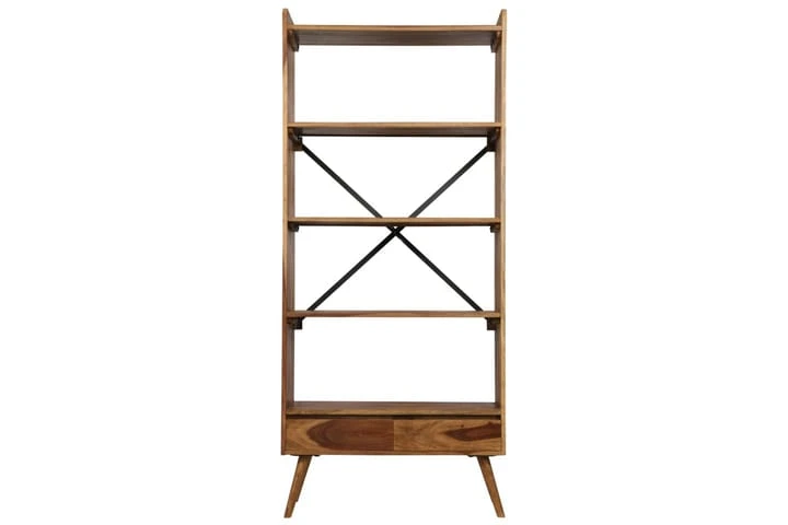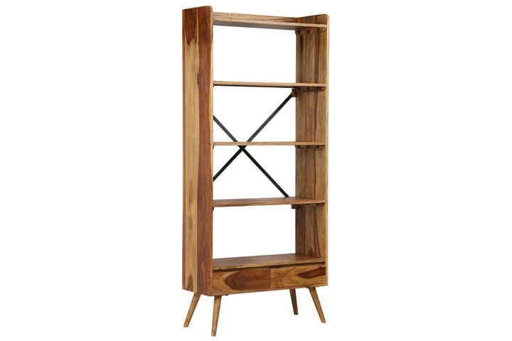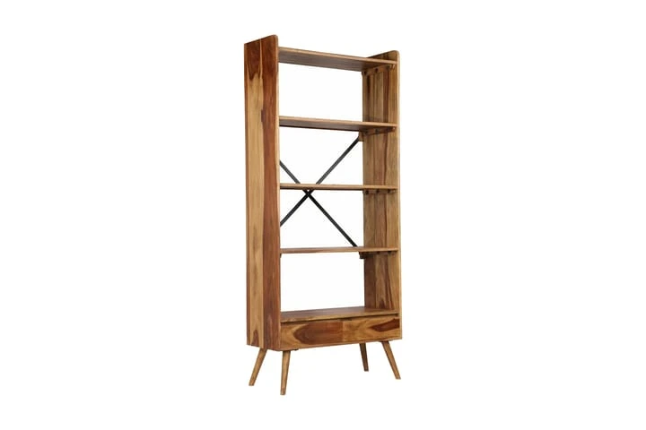 Bokhyllan är tillverkad i massivt sheshamträ och är mycket hållbart och stabilt. Shesham är ett tropiskt lövträ som är känt för sina rika ådringar. Det kallas även rosenträ eller palisander. De 4 stora hyllorna och 2 lådorna har gott om utrymme för att hålla dina böcker, dokument, DVD:er och andra föremål prydligt organiserade. Bokhyllan kommer att ge din inredning en rustik charm. Varje steg i tillverkningsprocessen utförs med största omsorg, vare sig det är polering, målning eller lackering. Monteringen är enkel.